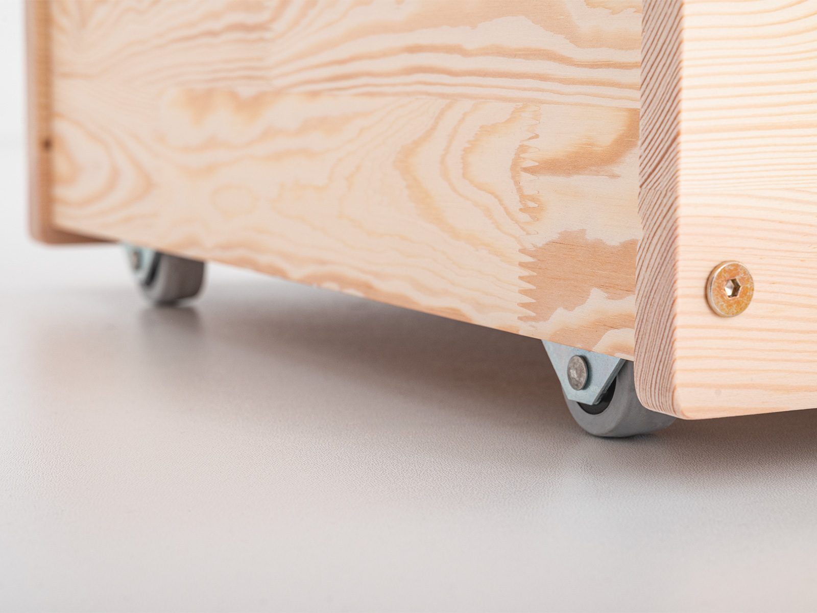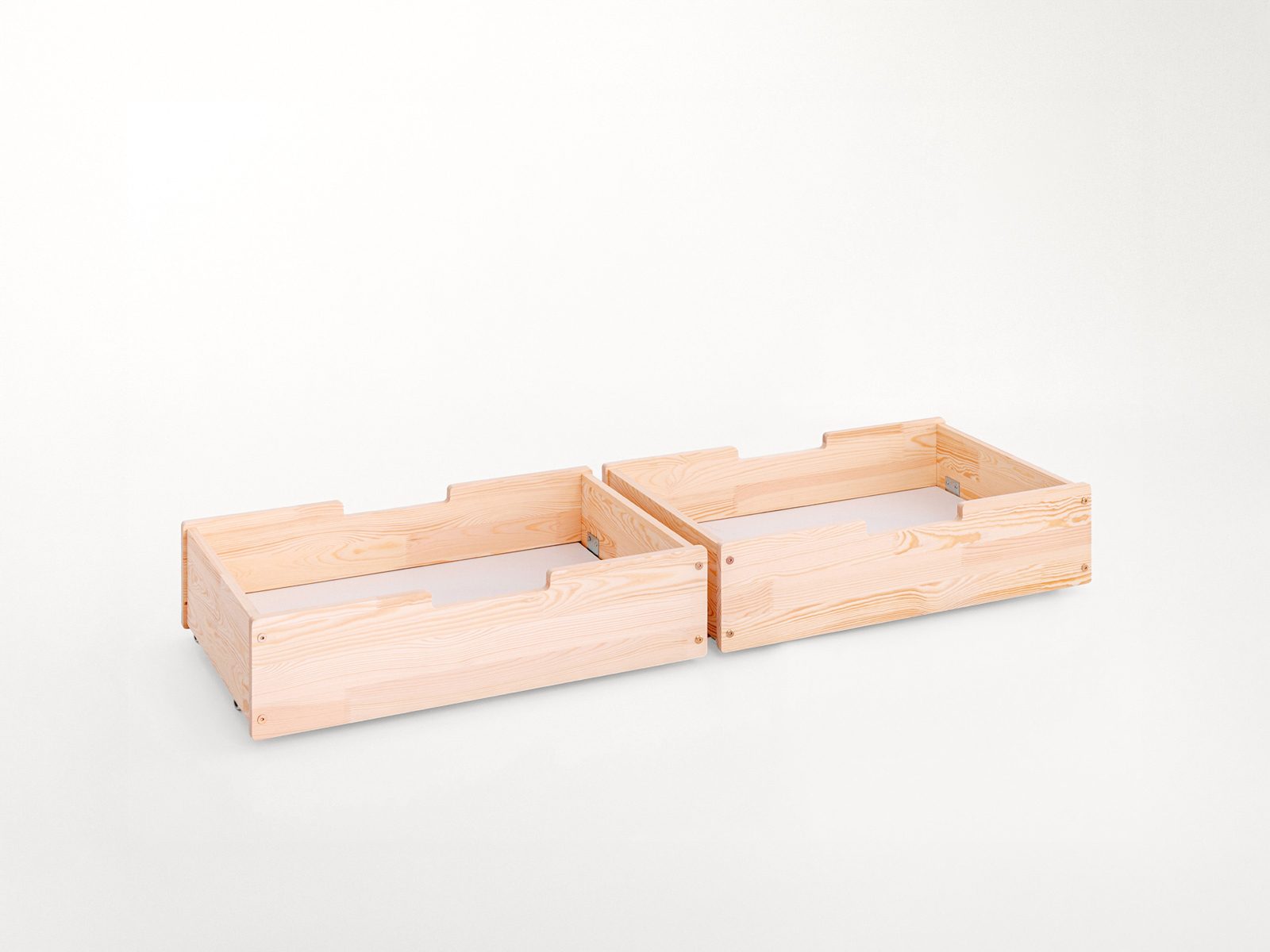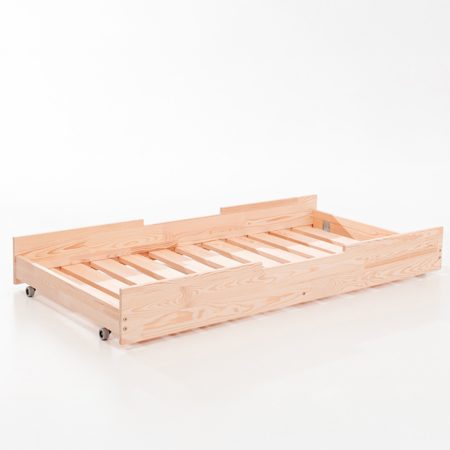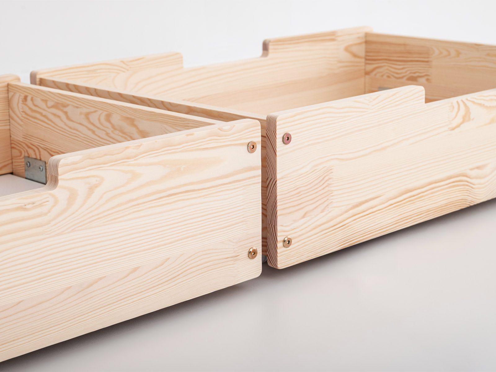 The double drawer for a bed is a practical solution that helps keep a child’s room tidy. Thanks to two separate storage spaces, it is perfect for storing bedding, toys, and other essentials. The drawer is equipped with wheels, ensuring smooth and effortless sliding. The fixed depth of 50 cm, regardless of the bed size, provides ample storage space and easy organization.