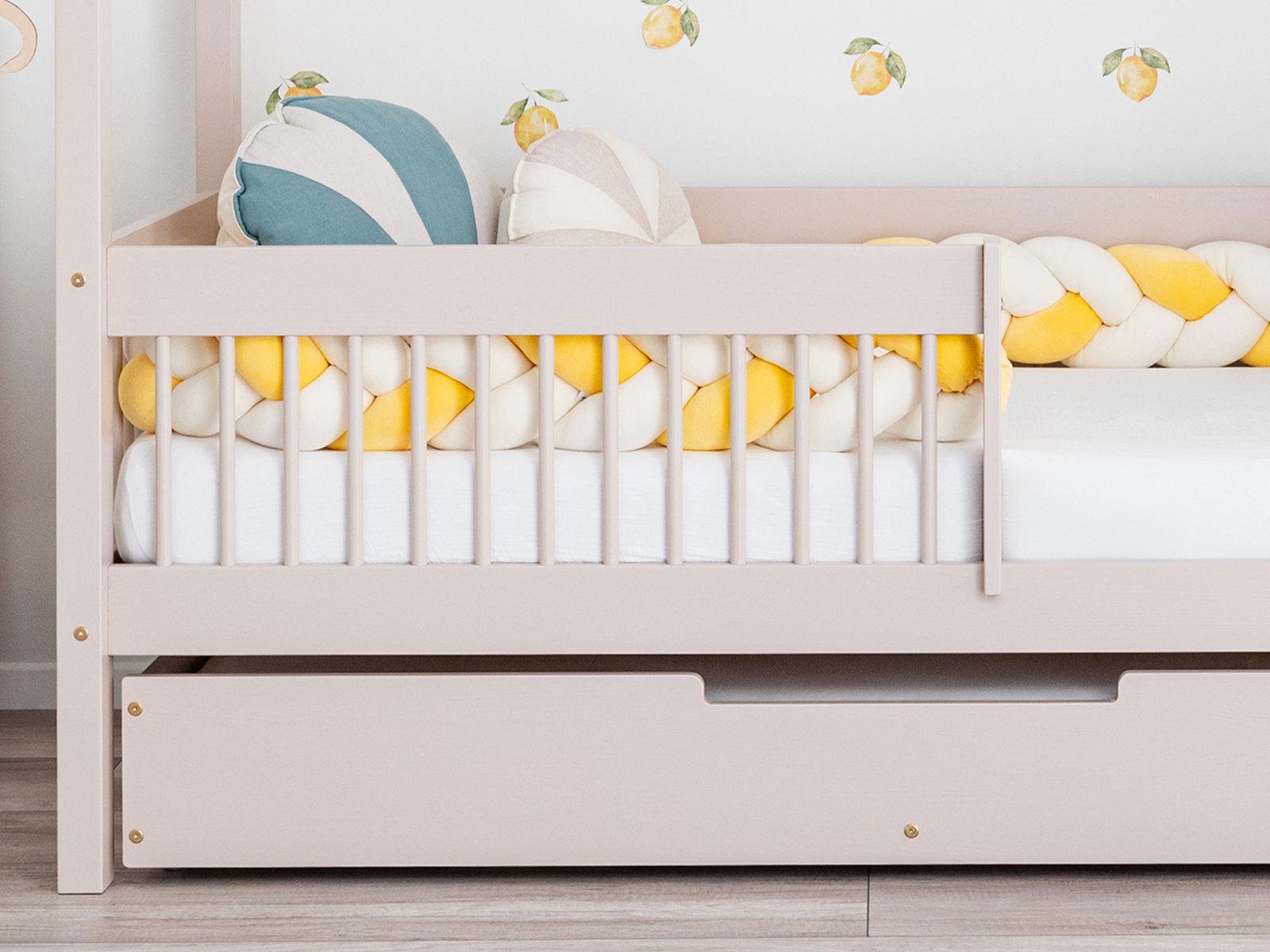 The Meli bed has been designed in line with Montessori principles. The bed feet are only 3 cm tall, and the mattress is located low over the floor. Such a design promotes the child’s self-sufficiency and independence as it may get into the bed and out of it safely without anyone’s help.