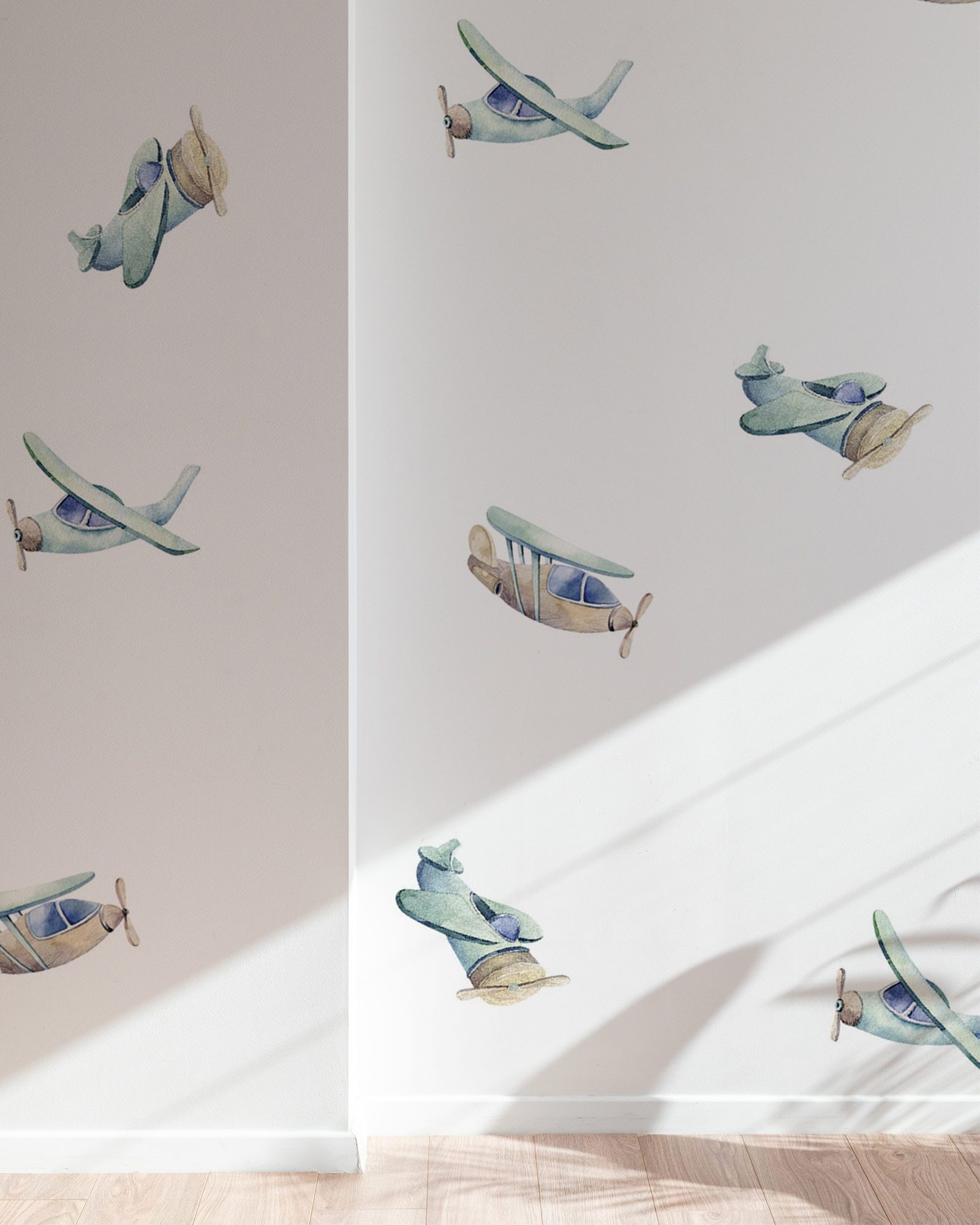 Airplanes, clouds and subtle details create a story on the wall that encourages creative play and curiosity, without overwhelming the space. Perfect above a bed, desk or reading corner, where it gently complements the everyday rhythm of the room.